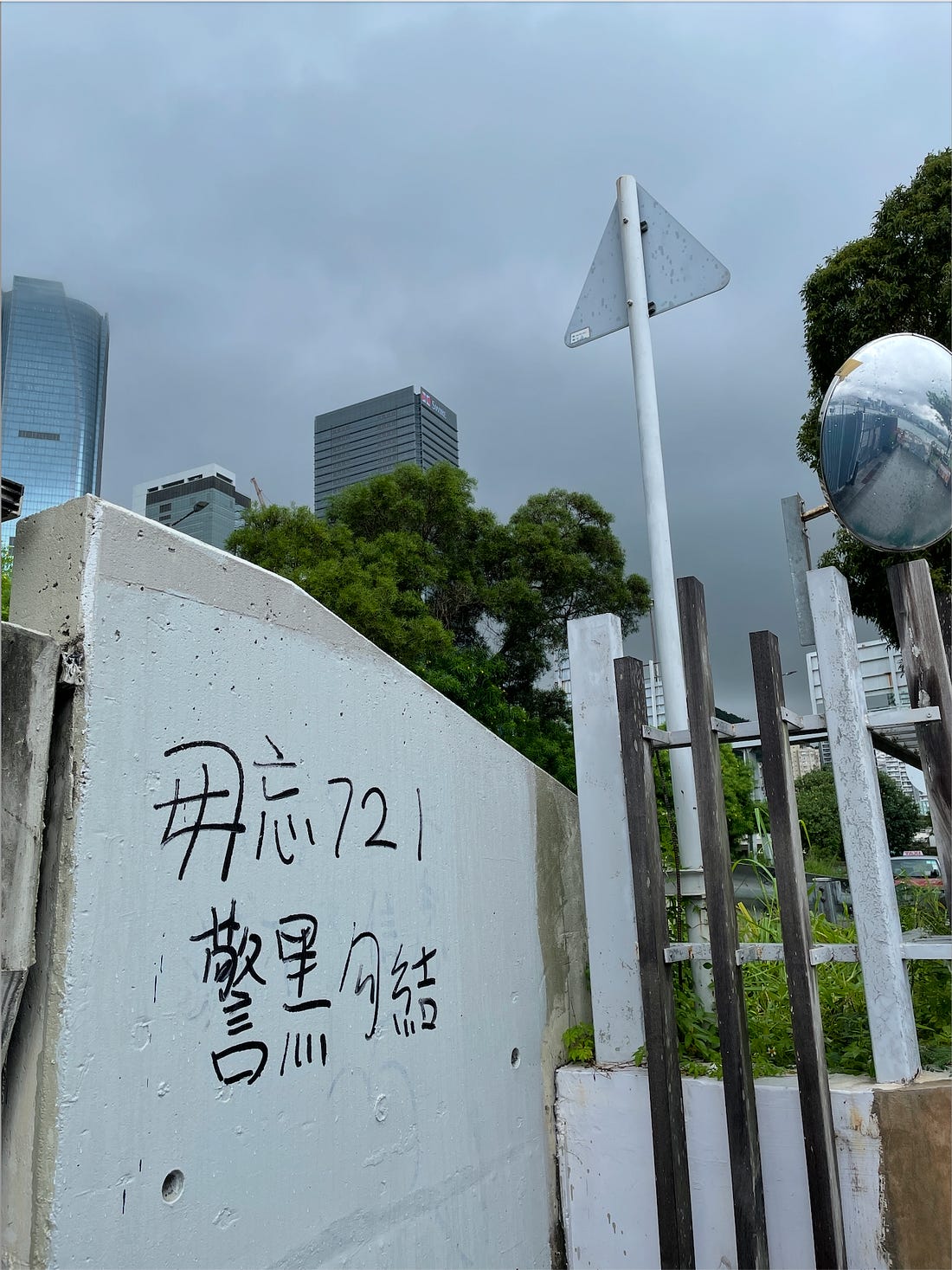 Graffiti on Hong Kong Island, seen on July 21, 2021, stating: “Do not forget 7/21. Police-triad collusion.” Photo by the author.
